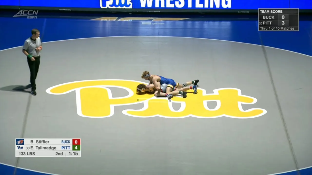 2025/26 Pitt vs Bucknell wrestling dual 133lbs #30 Evan Tallmadge (PITT) dec Blue Stiffler (BUCK) I do not own this video, all credit/rights to ESPN/ACC