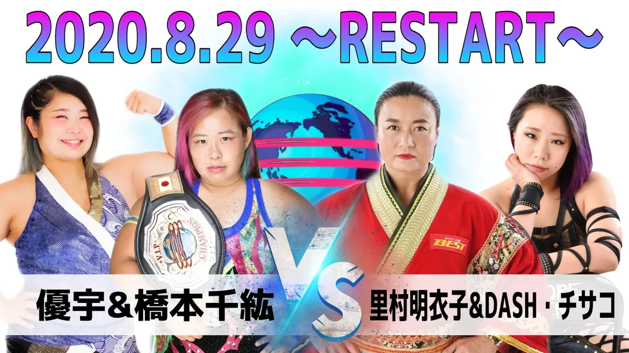 2020年8月29日(日)新木場1stRING大会 メインイベント タッグマッチ30分1本勝負 橋本千紘&優宇 vs 里村明衣子&DASH・チサコ 【試合結果】 2020年8月29日(土)東京新木場1stRING大会 会場:東京新木場1stRING レフェリー パンチ田原 リングアナウンサー ムーチャス入江 第1試合 じゃじゃ馬トーナメント敗者復活戦 6人タッグマッチ20分1本勝負 ×金子夏穂&Maria&AKARI(11:34 オカロック)〇岡優里佳&花穂ノ利&ななみ ※岡優里佳が勝利した為、じゃじゃ馬トーナメント2回戦に進出。 9月21日(月・祝)宮城野区文化センター大会にて、星月芽依vs岡優里佳が決定。 第2試合 シングルマッチ15分1本勝負 〇KAORU(11:45 エクスカリバー→片エビ固め)×星月芽依 第3試合 シングルマッチ15分1本勝負 ×愛海(14:59 さくらっち)〇旧姓・広田エリザベスさくら メインイベント タッグマッチ30分1本勝負 橋本千紘&×優宇(18:02 ホルモンスプラッシュ→片エビ固め)里村明衣子&〇DASH・チサコ