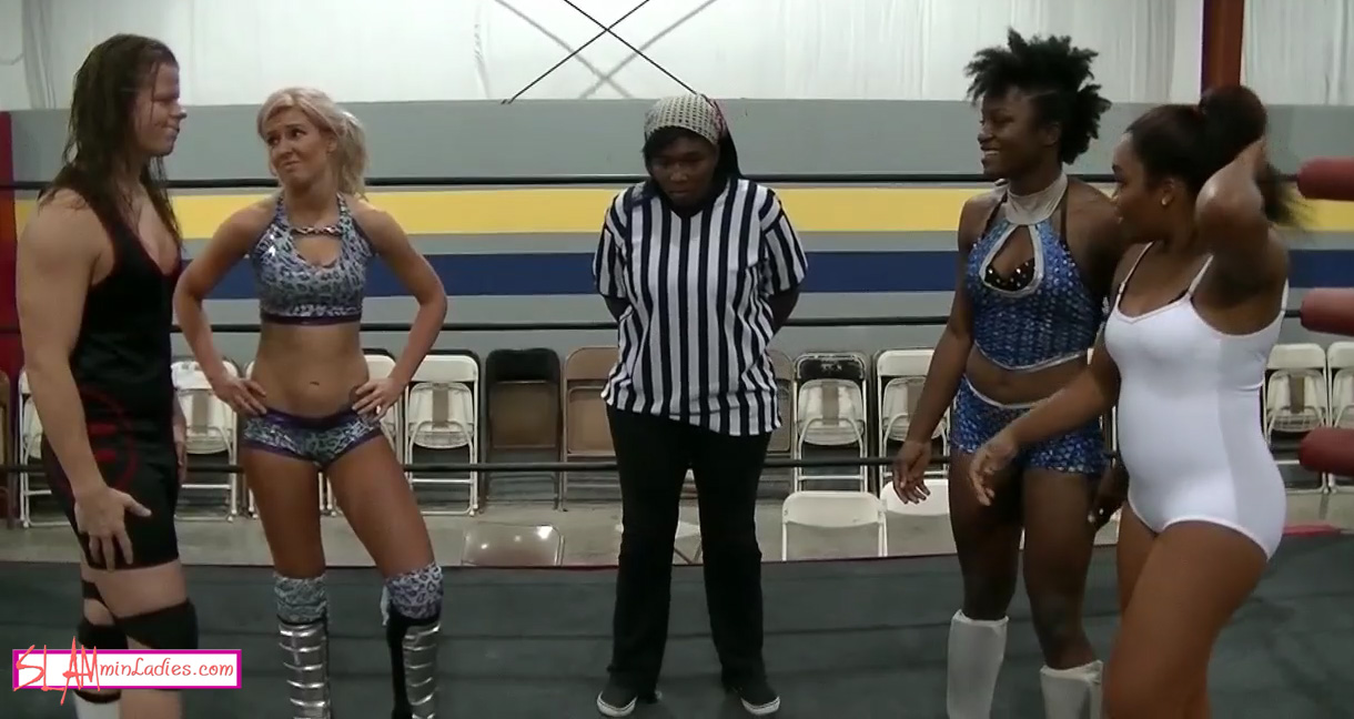 A bullying and arrogant Ray Lyn takes the rhetorical lead going into this match, dismissing opponents Aja and MJ as 'hoodrats' while showing off her physique. Then, with a vicious flick to the eye, she takes the physical lead as well, knocking a blinded Aja from pillar to post with the help of partner LT Falk. They double team her and keep her away from MJ, squeezing her into combo chokehold/scissors, disorienting her with stinkfaces and generally beating her down with an array of brawling tactics. Aja, however, manages to Clothesline and take LT down, opening up an opportunity for MJ to tag in and unleash a world of hurt on him. The duo punish him with DDTs, Atomic Drops and more as a helpless Ray Lyn looks on. Eventually, the hapless man is pinned easily, much to Ray Lyn's chagrin. Oddly, MJ and Aja are so pumped up that they decide to launch into a second match with each other, making this two matches in one SLAMeg! They showcase skilled chain wrestling and a variety of high impact and submission maneuvers, giving this video considerable bang for its buck!