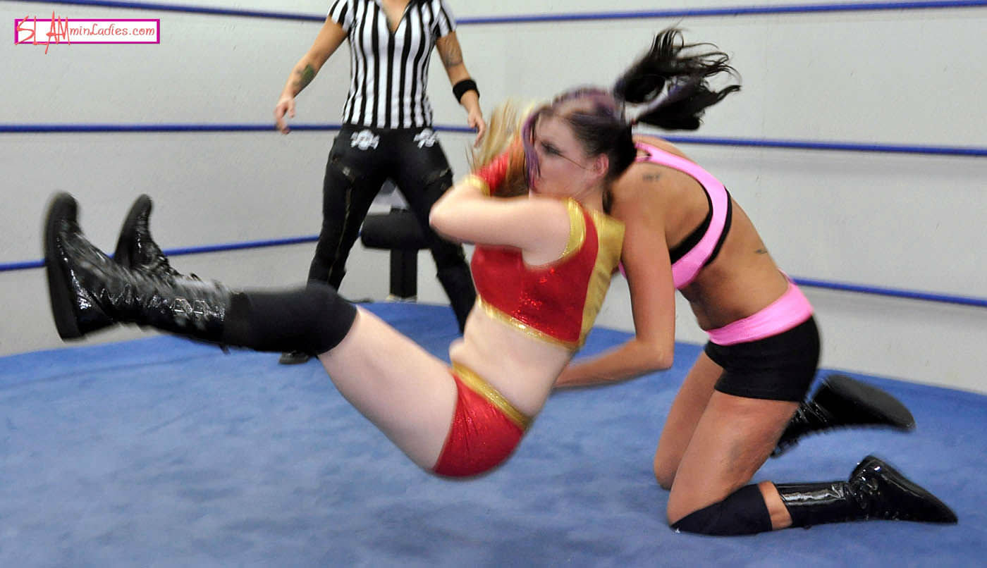 It's Iron Leva versus the Supermodel. After discussion of whether or not the Iron mask is a foreign object, we get to the… rock paper scissors? Okay, but after that… we get to the wrestling. Amy takes charge right away with a slam and brutal Surfboard stretch… Not to mention some rough cornerwork and a total lack of regard for the rules. Hello, backrakes and choking. But Amy just can't keep the Iron One down… because she keeps pulling her up at the 2 count! Even a Sidewalk Slam and a legdrop later, Amy still won't let sleeping Levas lie… So Amy is forced to go the submission route and locks in a tight Figure Four Leglock that has Leva moaning in pain. But she reverses… A Bearhug has Leva's lights going out, but she hangs on… Does Leva have enough battery power left to take down the Supermodel?