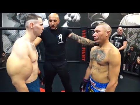 Here's what happens when a man injected with synthol in his arms drops an old man. He's not a body builder like Bradley Martyn, and he's not fighting Conor McGregor despite the tattoo on his opponents chest. What's happening instead, is the sheer mass of the synthol man drops the old man once.