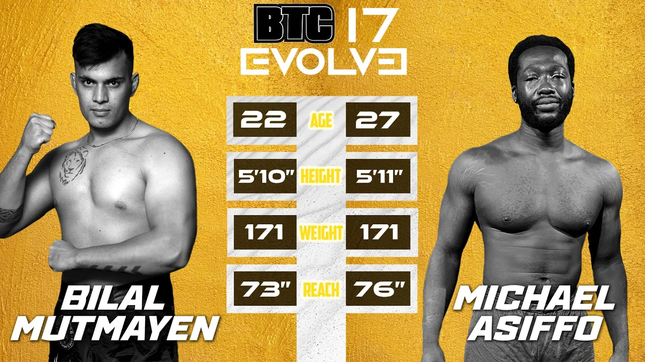 BTC 17: EVOLVE Mohammad Bilal Mutmayen vs Michael Asiffo BTC HQ | Burlington, ON | September 24th, 2022 0:00 - Pre-Fight Video 6:13 - Round 1 10:13 - Winner Announcement + Interview Commentary by Jason Hagholm and Josh "The Gentleman" Hill Next Event: BTC 18: Next Generation Dec 10th, 2022 | Burlington, Ontario Tickets: https://www.ticketscene.ca/events/42677/ PPV: https://btcfight.ca/live Website: https://btcfight.ca Instagram: https://instagram.com/btcfight FaceBook: https://facebook.com/btcfight TikTok: https://tiktok.com/@btcfight Twitter: https://twitter.com/btcfight