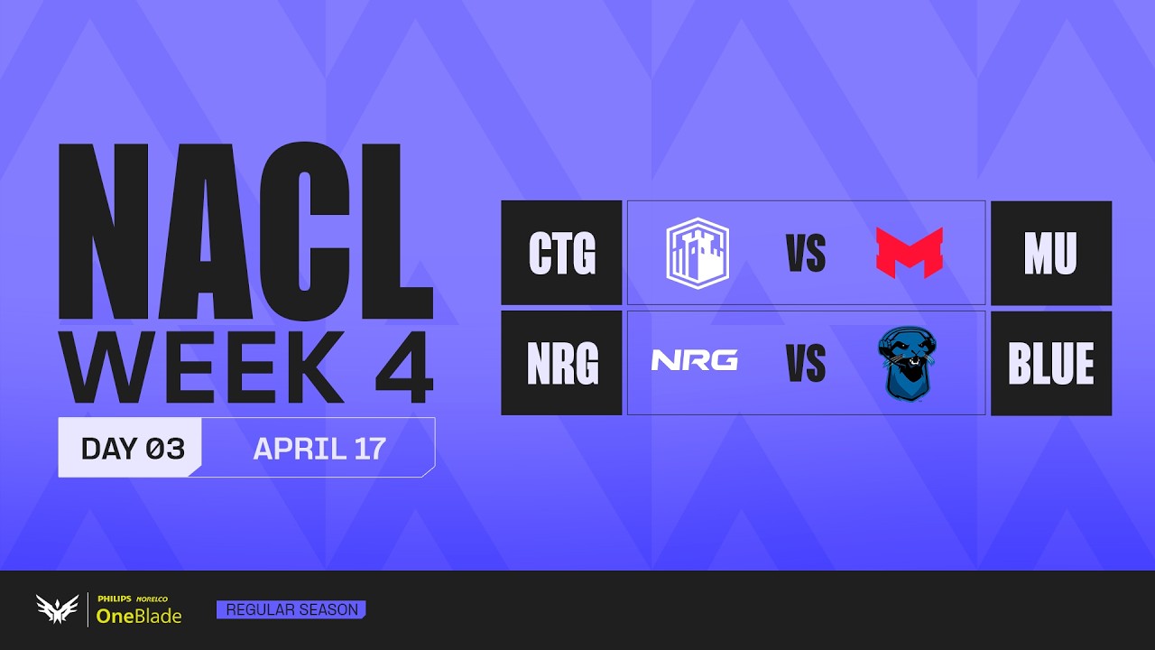 Regular Season NACL | Day 3 Week 4 | Bo3 Week 4 closes with high stakes matchups across the board. Games of the Day 1. CTG vs MU 2. NRG vs BLUE The gap is closing… and everyone feels it.
