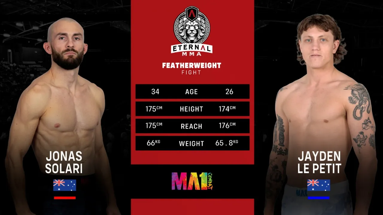 🔥 Welcome to Eternal MMA 98 ! 🔥 Watch as Jonas Solari takes on Jayden Le Petit in a thrilling matchup that showcases the best of Australian mixed martial arts! Eternal MMA is proud to be Australia and New Zealand's premier MMA promotion, bringing you the most electrifying fights from across the region. 🌟 About Eternal MMA: Based on Queensland's Gold Coast, we promote up to 11 events per year, featuring a talent pool filled with the finest MMA athletes, from rising amateurs to seasoned pros. Our events are known for their intensity, with undercards showcasing top amateur fighters from the Australia-Pacific region, and main cards packed with professional athletes in the most competitive bouts. 💥 Why You Should Watch: - Experience the excitement of live MMA action. - Discover the future stars of the sport. - Enjoy exclusive highlights, KO's, TKO's, and submission victories! 👉 Don't forget to subscribe to the Eternal MMA YouTube channel for all the latest fights and highlights, including full fight recaps, behind-the-scenes content, and more! Follow Us: - Facebook: Eternal MMA - Instagram: @EternalMMA - TikTok: @eternalmma - OnlyFans: Eternal MMA - Threads: @eternalmma 🌐 For more information, visit www.eternalmma.com. Join the conversation using hashtags: #EternalMMA #MMA #FightNight #AustralianMMA #FullFight #UFC #UFCFightPass