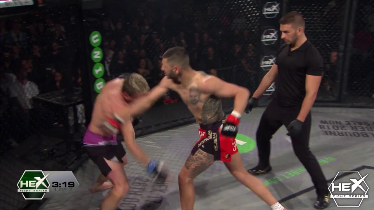 Alex Gorgees defeats Jai Bradney via 1st round KO at Hex Fight Series 16. e: info@hexfightseries.com w: www.hexfightseries.com f: www.facebook.com/hexfs instagram / twitter: @hexfs