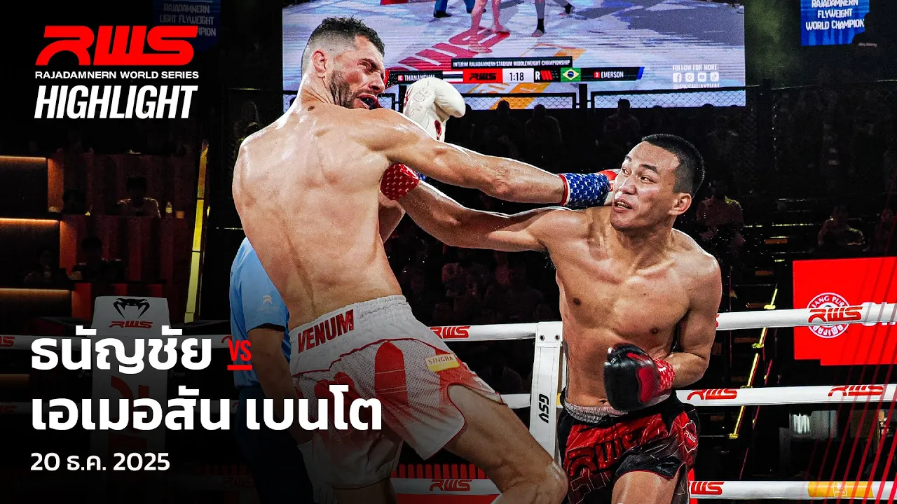 #ไม่ง่ายจริงๆ! 🥊 ไปชมกันเลยกับไฮไลท์คู่เอกของค่ำคืนนี้ ศึกชิงแชมป์เฉพาะกาลรุ่น 160 ปอนด์ของเวทีราชดำเนินระหว่าง 🇹🇭 "ธนัญชัย ศิษย์สองพี่น้อง" กับ 🇧🇷 "เอมเมอร์สัน เบนโต"! #ทุกคืนวันเสาร์ ตั้งแต่เวลา 20.05 เป็นต้นไป 🌏 : ถ่ายทอดสด 200+ ประเทศและเขตปกครองพิเศษทั่วโลกบน DAZN (นอกประเทศไทย) ในประเทศไทย 📺 : Workpoint หมายเลข 23 เฟซบุ๊ก : Workpoint Entertainment และ RWS - Rajadamnern World Series #RWS #RajadamnernWorldSeries #ราชดำเนิน #เวทีมวยราชดำเนิน #มวยไทย #DAZN #Workpoint #Workpoint23