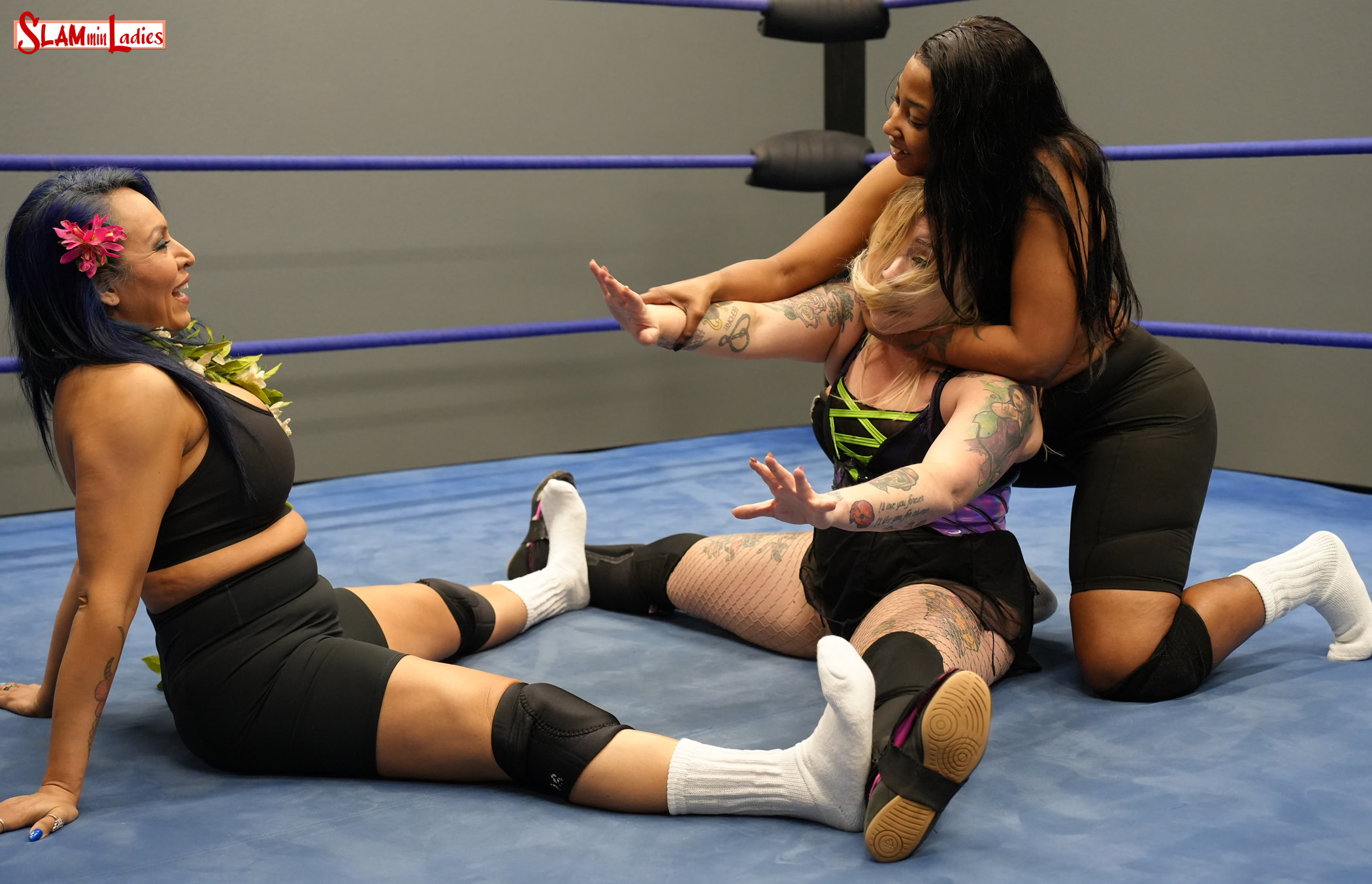 We open with Kimber storming in against 2 opponents at the same time, which is usually not a good idea. Kimber immediately gets stomped down, and since there's no ref the doubleteaming lasts for a long, long time. Tracy gets a Sleeper on Kimber, and Sahara then takes her place with a Surfboard. There's some serious 2 on 1 stretching and hairpulling going on here, and Kimber's arms and legs are definitely not supposed to bend that way! Sahara locks Kimber in a seated Full Nelson with bodyscissors, while Tracy pulls on her arms with a Surfboard. There's all sorts of nasty combo submission holds Sahara and Tracy have in store for their victim, and there's very little Kimber can do about it except scream. She endures a Camel Clutch before being locked in an armbar/Boston Crab combination, then gets choked and stomped mercilessly. Sahara and Tracy take turns ramming Kimber's face into the turnbuckles and dragging her face across the ropes. But there's more punishment for Kimber, as she gets hooked in a Bow & Arrow stretch by Tracy while Sahara bites her fingers! Then there's Bearhugs and much more, until finally Tracy and Sahara decide to finish off Lee with a double Suplex and a double pin for good measure. Kimber gets tossed out of the ring, and even then the beatdown continues. Bring a tag partner next time Kimber!