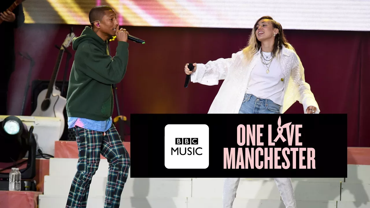 Pharrell Williams and Miley Cyrus perform Happy at One Love Manchester. Visit the BBC Music website for more videos http://www.bbc.co.uk/programmes/p054q63t