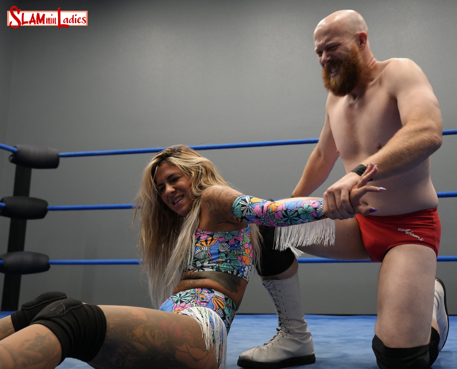 Newcomer Shelly locks up with Chico as the pair get right to work. Armlocks, Headlocks, Hammerlocks and reversals dominate the early action until Shelly sends Chico on his backside with a shoulderblock. Adams retaliates with a kneelift and takes control, working Shelly over with Headbutts, turnbuckle smashes and a rope-leveraged double arm stretch. Shelly takes a beating but manages to reverse a whip to the corner and follows up with a splash on a stunned Chico! Shelly takes the fight to Adams, choking him out on the ropes. Chico may not have expect such a battle from his inexperienced foe and is forced to brawl his way back into the match. He hits a stunning elbow to the back of Shelly’s head and claps a kneed Surfboard on his dazed opponent. Benson takes a moment to recover, but fights her way free before clamping on a tight Sleeper. Chico makes it to his feet with Shelly riding his back, but can he find a counter to the deadly hold before Shelly puts him out for good?
