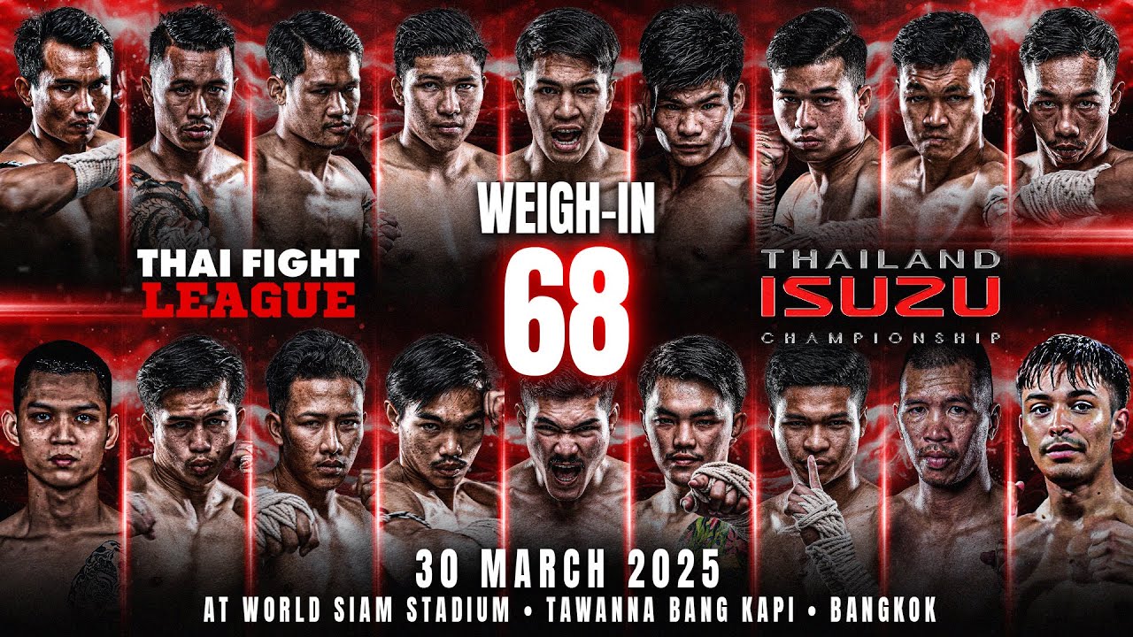 Thai Fight League presents the Isuzu Thailand Championship 2025 on March 30. In the 65 kg category, “Sainampetch Muaythai Active” (Lower-Isan team) takes on “Kiatpetch Suan-Arhan Peekmai” (Upper-Isan team), while in the 61 kg category, “Yodkomkrit Sor.Sunan” (Central team) faces “Prabsuek Sitkaewprapon” (East team). The event also features a Super Fight with “Busan Prasathinphimai,” “Tanonchai Sudsakorn Muaythai Gym,” and “Benz Siam Prasathinphimai Phran 26,” alongside a 110 kg showdown between “Palmthong Petchnongkee” and “Trent Fitzgerald.” THAI FIGHT LEAGUE #68 🗓️ On Sunday, March 30, 2025 📍 At WORLD SIAM STADIUM, Tawanna, Bang kapi ⏰ LIVE 6 p.m. to 8 p.m. (ICT) 📺 TH Channel 8 Press 27 (TH & EN) 🇹🇭 ไลฟ์สด: youtu.be/watch?v=eN1ZiCmCW4s 🇬🇧 Live: youtu.be/watch?v=WNS3_mDIBX0 . #ThaiFightLeague #THAIFIGHT #KardChuek #ไทยไฟท์ลีก #ไทยไฟท์ #ไทยไฟท์ล่าสุด #muaythai #MuayBoran #thaifightkardchuek . Facebook : Thai Fight : https://www.facebook.com/thaifight.official/ Instagram : https://www.instagram.com/thaifight_official/ Twitter : https://twitter.com/THAIFIGHT_TWT Tiktok : https://www.tiktok.com/@thaifight.official Website : http://www.thaifight.com/
