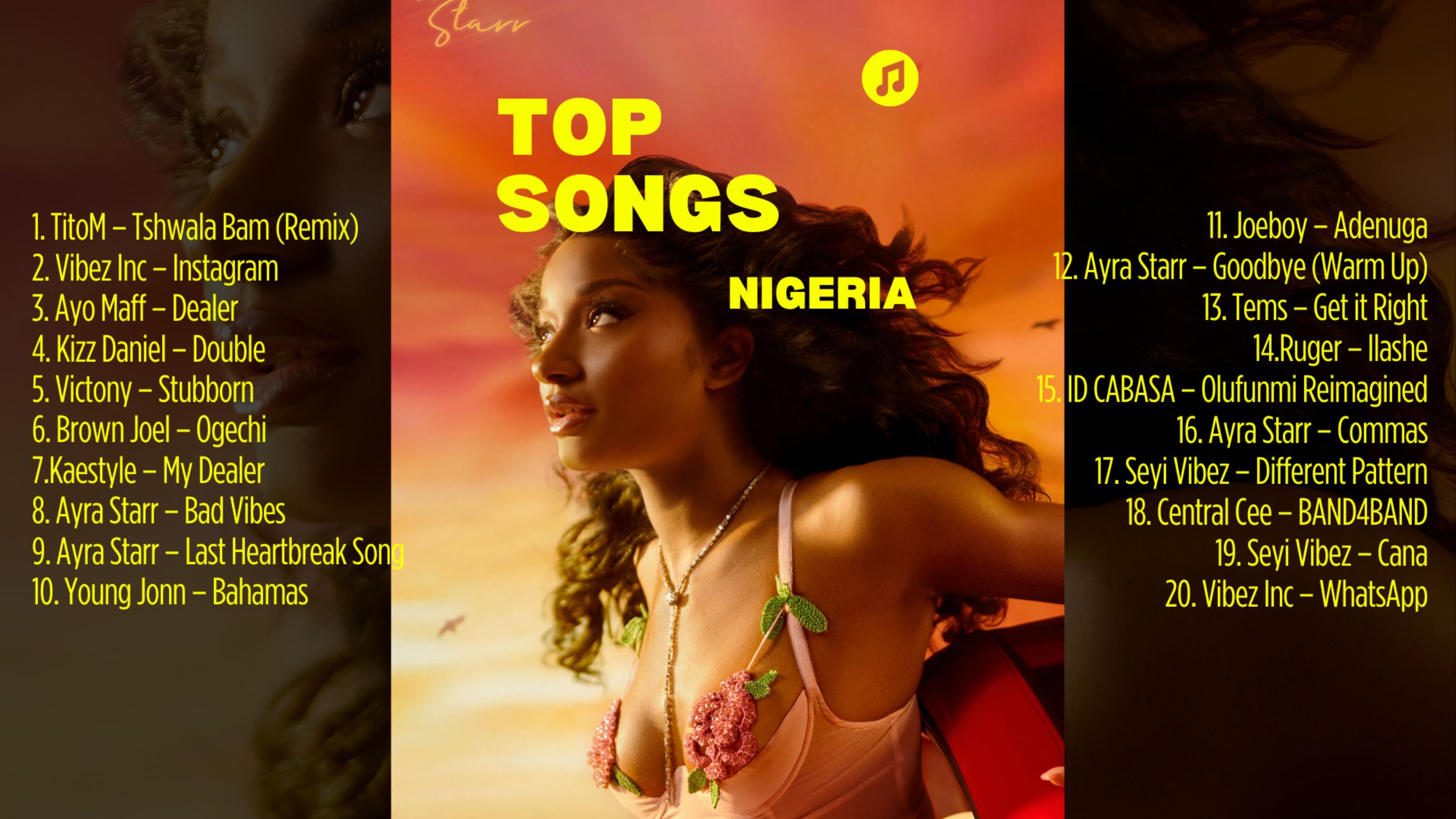 The most streamed songs of June 2024 in Africa. 1. TitoM – Tshwala Bam (Remix) 2. Vibez Inc – Instagram 3. Ayo Maff – Dealer 4. Kizz Daniel – Double 5. Victony – Stubborn 6. Brown Joel – Ogechi 7.Kaestyle – My Dealer 8. Ayra Starr – Bad Vibes 9. Ayra Starr – Last Heartbreak Song 10. Young Jonn – Bahamas 11. Joeboy – Adenuga 12. Ayra Starr – Goodbye (Warm Up) 13. Tems – Get it Right 14.Ruger – Ilashe 15. ID CABASA – Olufunmi Reimagined 16. Ayra Starr – Commas 17. Seyi Vibez – Different Pattern 18. Central Cee – BAND4BAND 19. Seyi Vibez – Cana 20. Vibez Inc – WhatsApp