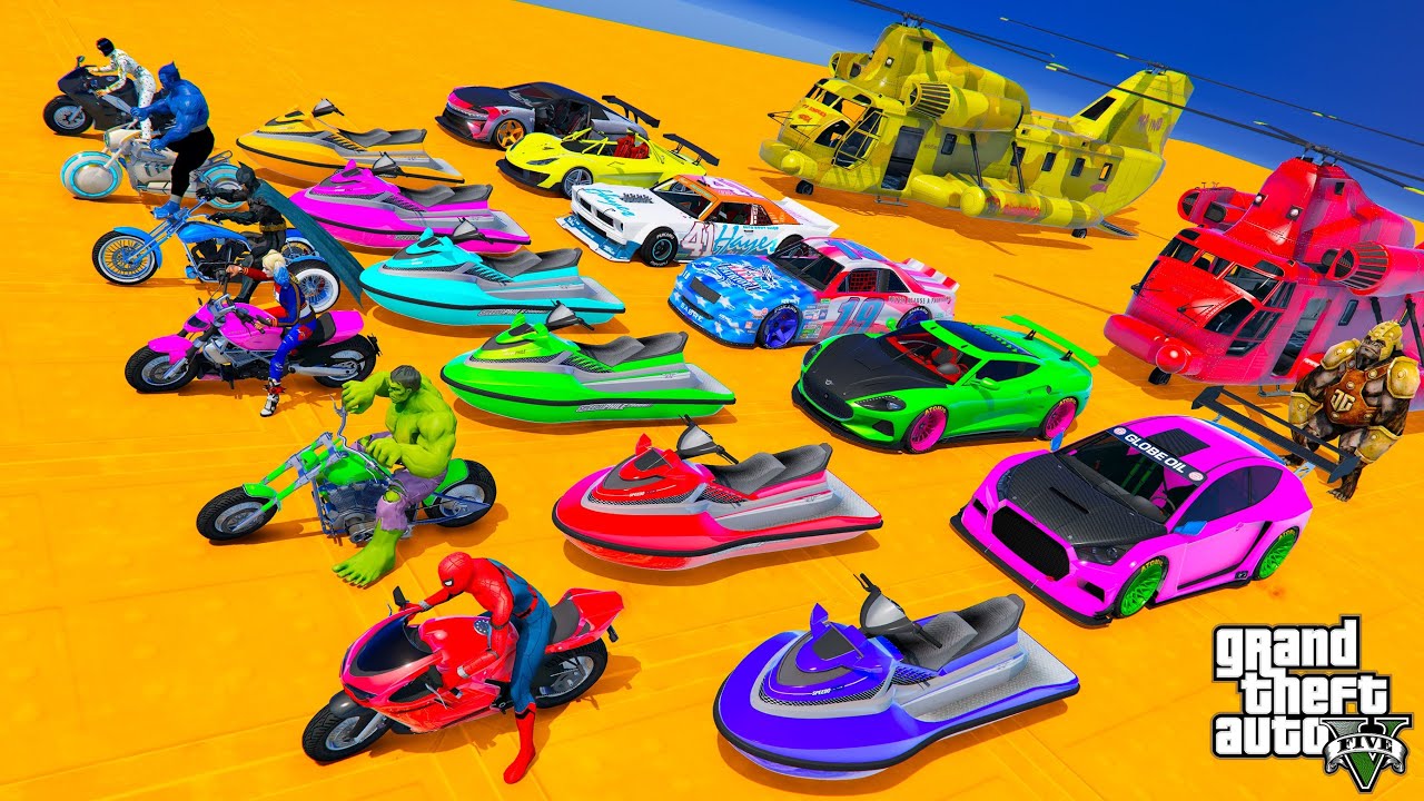 GTA V Awesome Double Mega Ramps by Sport Cars, Jet Skis & Motorcycles with Spiderman & Superherors