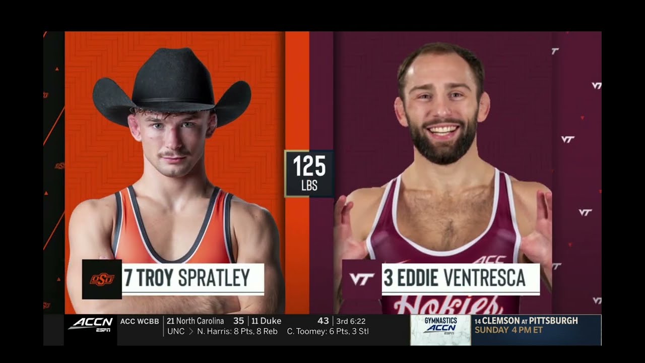 2025/26 Virginia Tech vs Oklahoma State wrestling dual 125lbs #3 Eddie Ventresca VTECH dec TB #7 Troy Spratley (OKST) I do not own this video, all credit/rights to ESPN/ACC