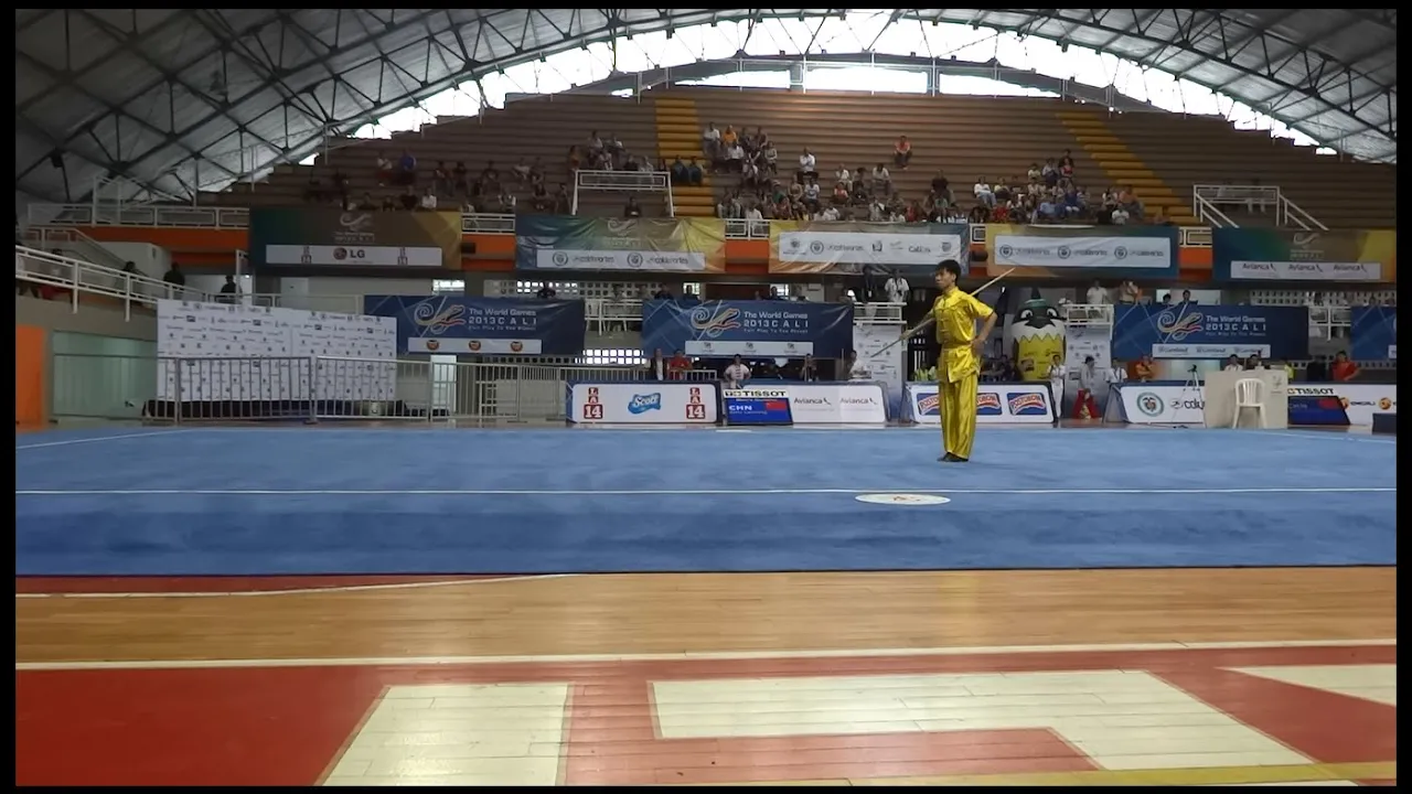 2013-8-3 The World Games 世界运动会 Cali, Colombia. Men Gunshu 男子棍术 China 中国 Zhu Leiming 朱雷明 9.73 (1st place). Last month (Sept 2014), Sichuan's Zhu Leiming took Gunshu 1st place at the Second 2014 China National Wushu Championships