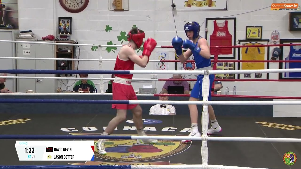 David Nevin (Elite Mullingar) and Jason Cotter (Cove) in the 2024 National Junior 2 Championship 66kg quarter final, streamed by @streamsport-ie7508 #boxing #boxingireland #boxer #irishboxing #IABA #olympicsport #iaba #bout #fight #titleboxing #championshipboxing #boxingnews