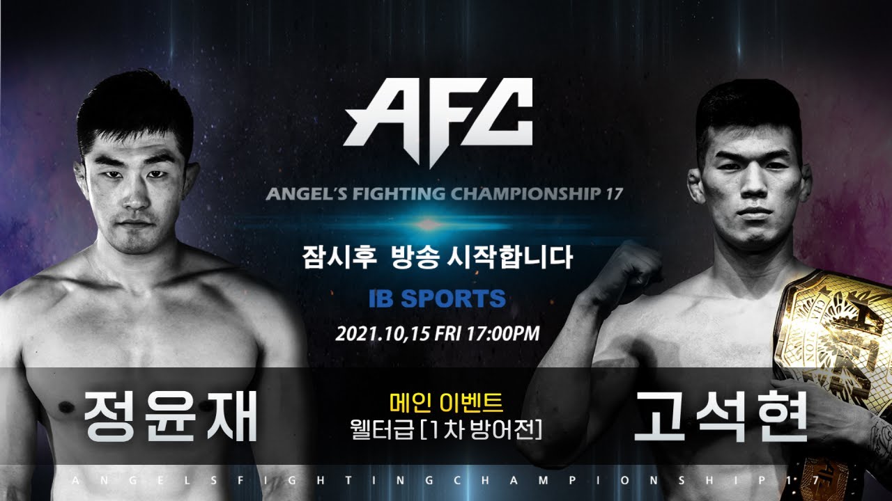 AFC 17 [경기순서] 1경기 MMA 계약체중-59KG :신창현(천무관)VS박창빈(거제 아셀주짓수) 2경기 MMA 페더급-65.8KG : 최은호(TTMC)VS박지한(TEAM BOSS) 3경기 MMA 아톰급-48KG : 최인녕(MMA팩토리)VS최제이(코리안좀비MMA) 4경기 MMA 페더급-65.8KG :정준희(왕호MMA)VS유주상(FREE) 5경기 MMA 라이트급-70.4KG : 권도형(구미팀혼)VS김경록(팀매드) 6경기 MMA 라이트급-70.4KG : 박재현(코리안좀비MMA)VS김종백(MMA스토리) 7경기 MMA 웰터급-77.2KG : 박충일(더짐랩)VS김상욱(팀스턴건) 8경기 입식 라이트급-70.4KG : 허새움(부산전사체육관)VS하운표(대무팀카이져) 9경기 MMA 웰터급-77.2KG : 정윤재(싸비MMA/더블지FC)VS고석현(하바스MMA,팀스턴건)