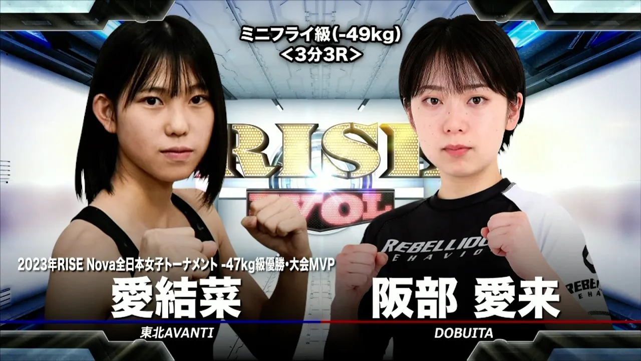 【2025年2月11日 RISE EVOL.13】 ▼ミニフライ級(-49kg)3分3R 阪部愛来(DOBUITA) 愛結菜(東北AVANTI/2023年RISE Nova全日本女子トーナメント -47kg級優勝・大会MVP) 【RISE EVOL.13】 1.https://youtu.be/puYq0Y9xGX8 2.https://youtu.be/iLnB45Dx1NY 3.https://youtu.be/O_avsQ2SvLs 4.https://youtu.be/-QjMwFMtFB8 5.https://youtu.be/TiCbIjVLkBg 6.https://youtu.be/UKvJB8bpiDU 挨拶.https://youtu.be/csfTZ5DI0ZM ◆RISE公式チャンネルの登録お願いします◆ https://www.youtube.com/channel/UCcPVn1ydbDjcBmUE9nWrfsA ◆Please subscribe to RISE official channel◆ https://www.youtube.com/channel/UCcPVn1ydbDjcBmUE9nWrfsA ◆RISE Website▷http://www.rise-rc.com ◆Official WEB SHOP▷https://rise-rc-shop.com/ ◆Official Twitter▷https://twitter.com/RISE_2003 ◆Official Instagram▷https://www.instagram.com/rise_2003official