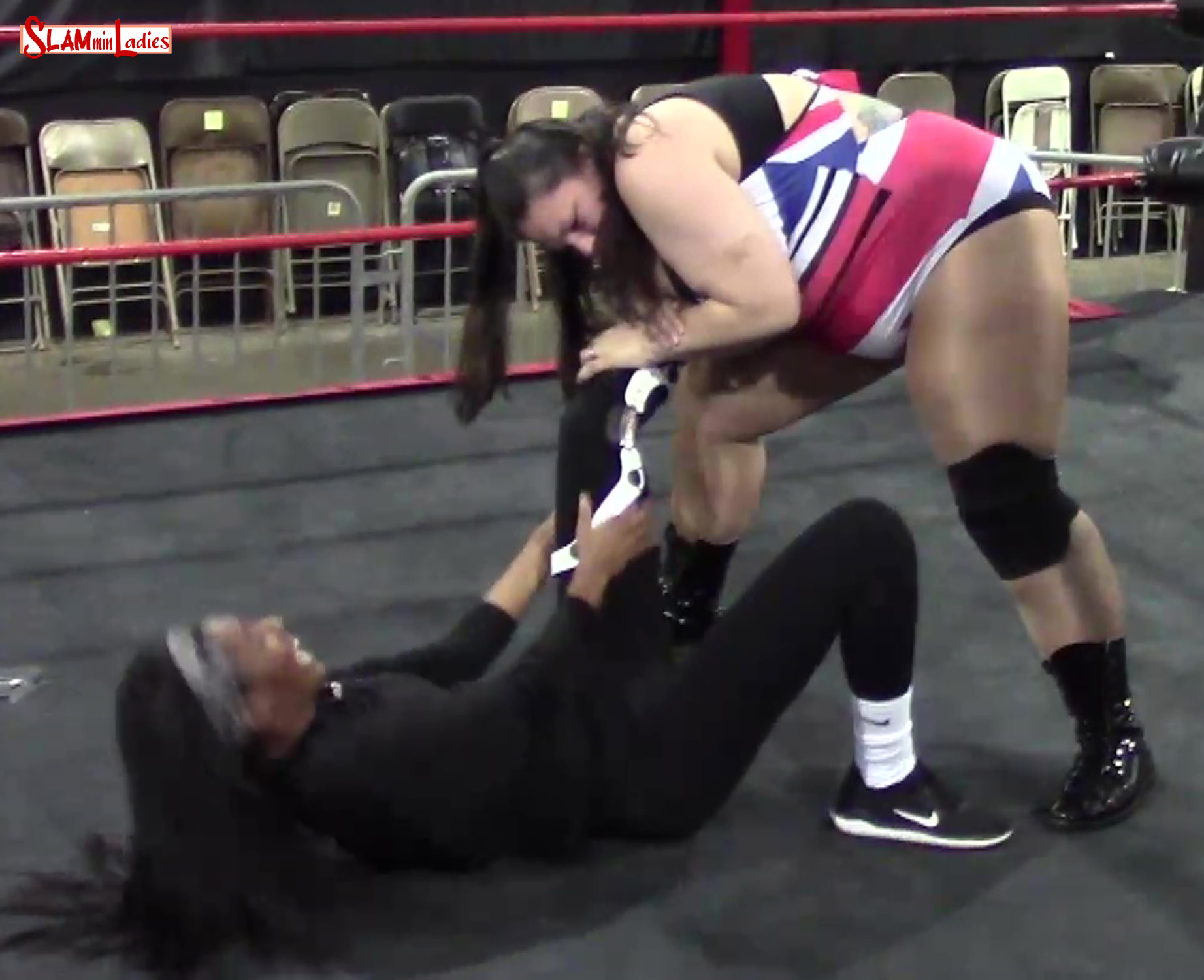 The heavy knee brace Camron wears as she stretches along the ropes is a clear indication she’s working her way back from a serious injury. Miss Rachel is in foul mood as she strolls in, exercising her home ring right to an open challenge against Camron. Despite her injury, Camron accepts, but takes a boot to the gut and DDT right out of the gate. Any notion that Rachel would go easy on her injured foe disappears as she spikes Branae into the canvas with another DDT! The brutal Brit targets Camron’s injured knee, bashing it with body splashes, chop blocks and chair shots, bending it with stepover toeholds and rope-leveraged leg stretches, and hyper-extending it with hanging leglocks and Figure Four variations. Bra'nae valiantly refuses to submit even as she risks irreparable damage to her already injured limb. Finally, after a series of repeated body splashes across her injured leg, Camron can take no more and submits the match.