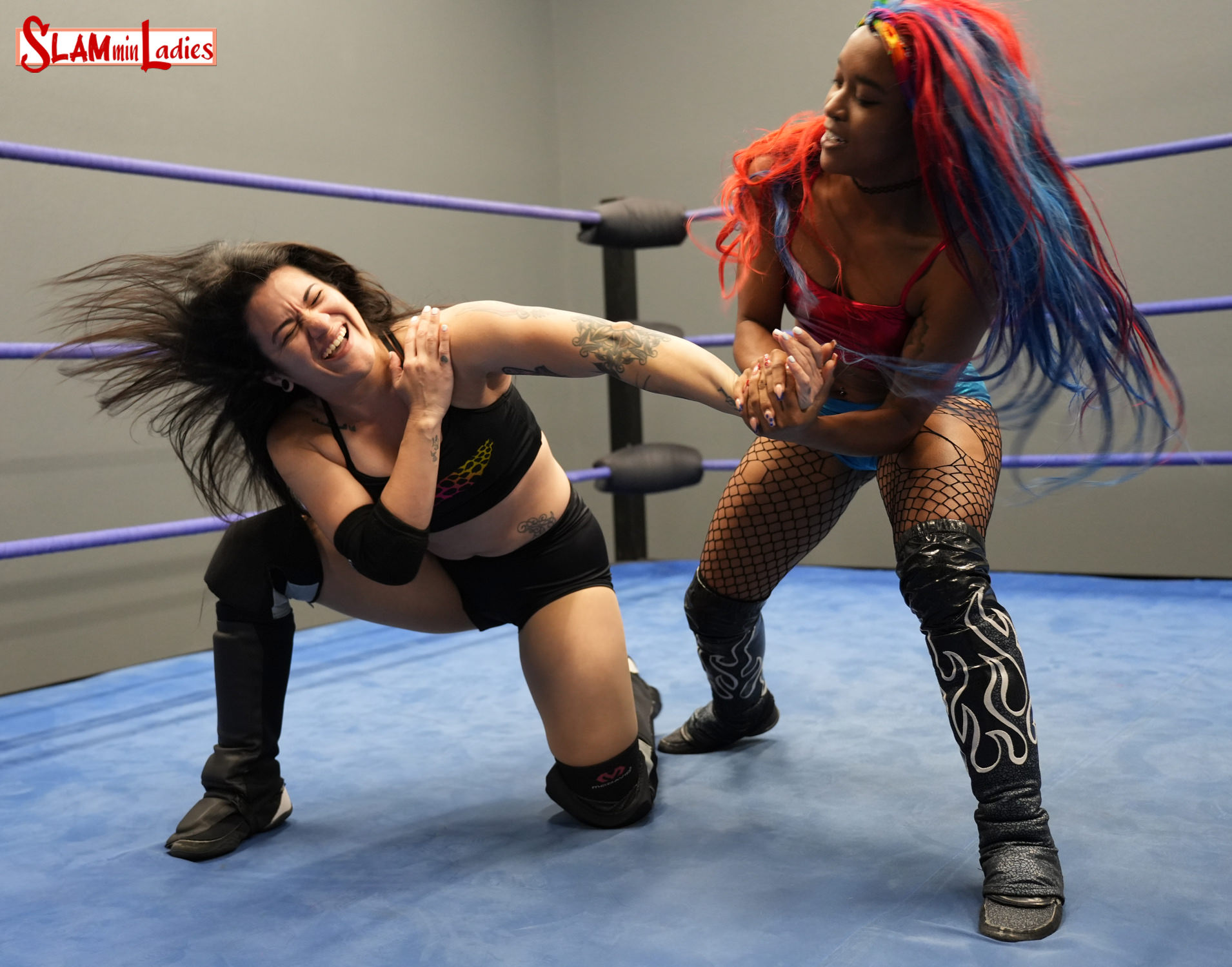 Diamante seems eager to challenge the bright haired Kiera and she quickly Snapmares her to the mat and gets her in a Sleeperhold but Kiera expertly counters into a Wristlock. Diamante gets excited by this display of skill and counters into her own Wristlock followed by another Sleeperhold. Kiera elbows her way out of it and sends Diamante into the turnbuckle where she uses her foot to choke the spunky spirit out of her opponent. Kiera goes for the pin but only gets a 2 count with Diamante gasping, "Not like that. Not today!" Kiera is furious about Diamante's refusal to stay down and stands on her throat in a display of heelish dominance but Diamante brings her to the ground and applies a Headlock but Kiera pulls the hair to escape. Kiera then kicks Diamante around the ring and goes for another pin but Diamante kicks out once again. Now Kiera is getting frustrated and she brings Diamante to her feet and applies a guillotine headlock but Diamante reverses it into a Russian Leg Sweep. Will Diamante's toughness win the day or will Kiera's dirty tactics score the victory? The bout could go either way!