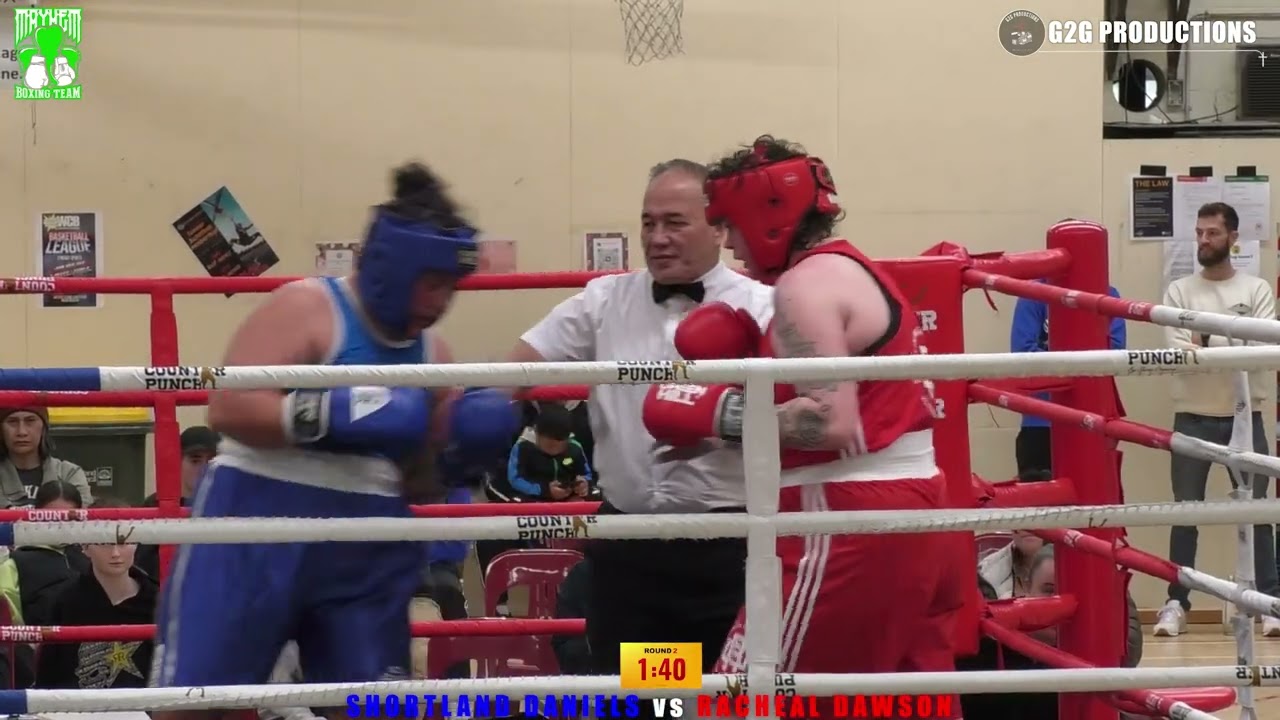 Boxing match between SHORTLAND DANIELS vs RACHEAL DAWSON Night of Mayhem Boxing Event promoted by Mayhem Boxing Contact Mayhem Boxing Team on Facebook: www.facebook.com/mayhemboxingteam Instagram: www.instagram.com/nzmayhemboxingteam/ for information to compete in upcoming corporate boxing shows in New Zealand For more content we are also on: - Facebook: www.facebook.com/G2GProductionz Instagram: www.instagram.com/g2gproductions/ YouTube: www.youtube.com/@g2gproductions426 TikTok: www.tiktok.com/@g2gproductions