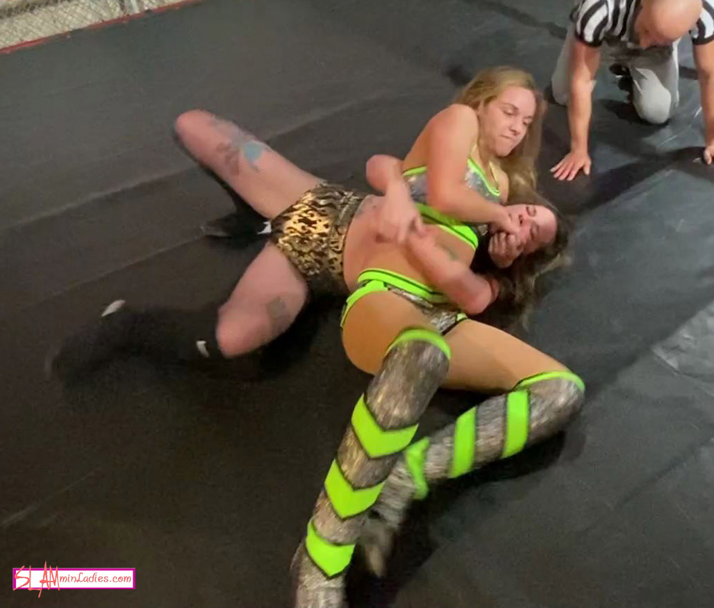 When these 2 lockup they are trying to bull each other around the ring. The inconclusive struggle leads to a test of strength with some fancy reversing and ends with some sore fingers. When things go the mat it's still back and forth with each lady pouring the pressure on. Salena comes on strong and Nikki takes some serious hits and kicks, Nikki comes back and they trade some severe legholds. The ending of this high-energy fight comes out of nowhere and you'll be exhausted from just watching these 2!