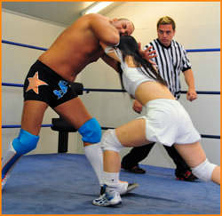 Sumie gains the early advantage in this one prompting her, er, "follicle-y challenged" opponent to complain of hair pulling. Sumie uses lucha libre style moves to keep Shooting Star off-balance, but it is only a matter of time before she finds herself grounded by a vicious Lariat. Once he gains the advantage, Star uses every underhanded trick in the book, including blatant chokes and eye pokes. Lots of stiff, Memphis style offense from Star in this match. Every time Sumie starts to gain any steam, she is cut off by a sharp elbow or a closed fist to the head. Star doesn't take his opponent lightly and looks to put her away with some nasty slams and painful MMA-style armlocks. Sumie shows a lot of heart in this match, but is she in over her head? After some back-and-forth action, a slick reversal allows one wrestler to snatch victory from the jaws of defeat.
