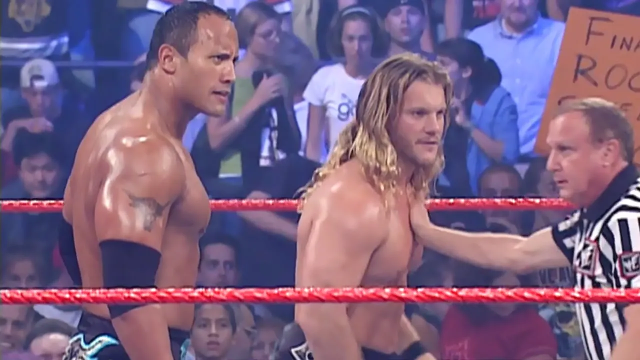 Rock/Jericho and Booker T/Rhyno face off against each other in a tag match 6 days before their matches at SummerSlam. RAW 8/13/2001 #we #therock #chrisjericho #bookert #rhyno #stephaniemcmahon #shanemcmahon #attitudeera