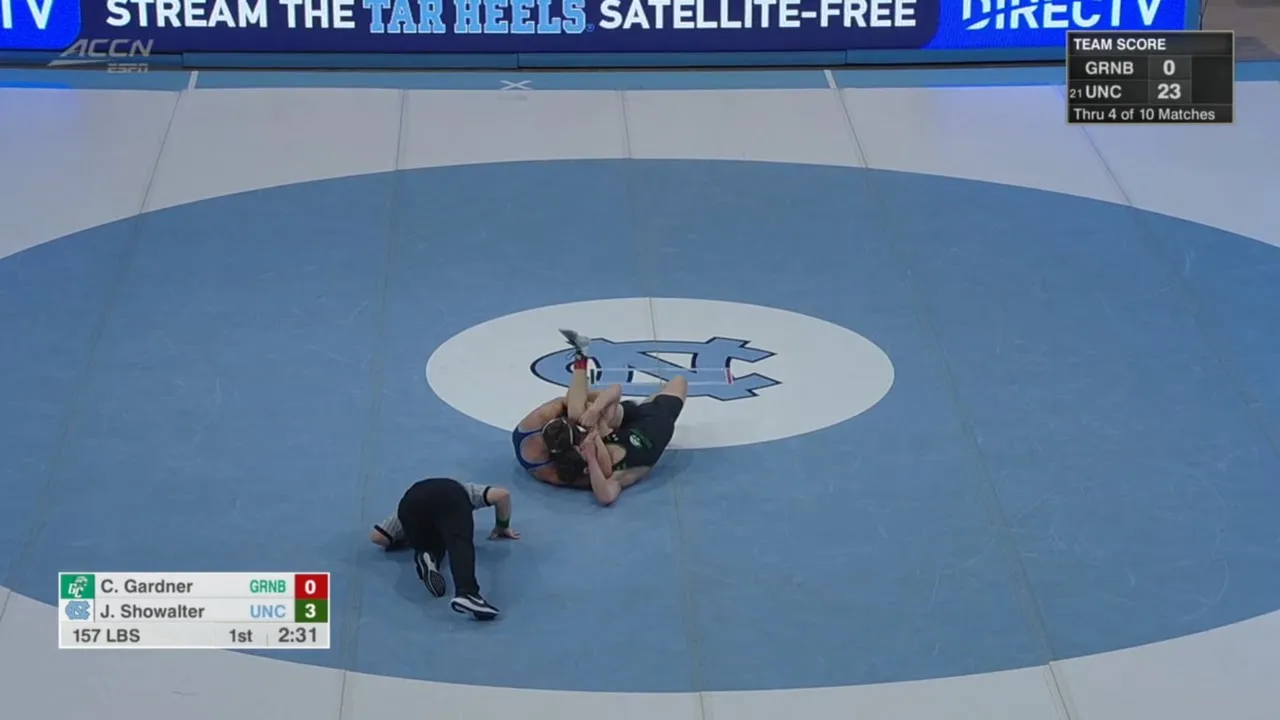 2025/26 North Carolina vs Greensboro wrestling dual 157 Joey Showalter UNC fall Carson Gardner GC I do not own this video, all credit/rights to ESPN/ACC