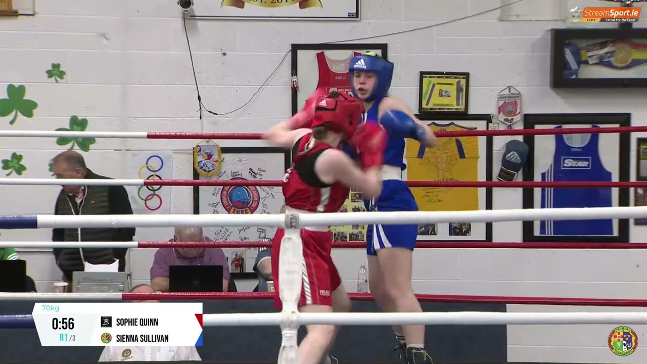 Sophie Quinn (Castlebar) and Sienna Sullivan (Conamara) in the 2024 National Junior 2 Championship 70kg quarter final, streamed by @streamsport-ie7508 #boxing #boxingireland #boxer #irishboxing #IABA #olympicsport #iaba #bout #fight #titleboxing #championshipboxing #boxingnews