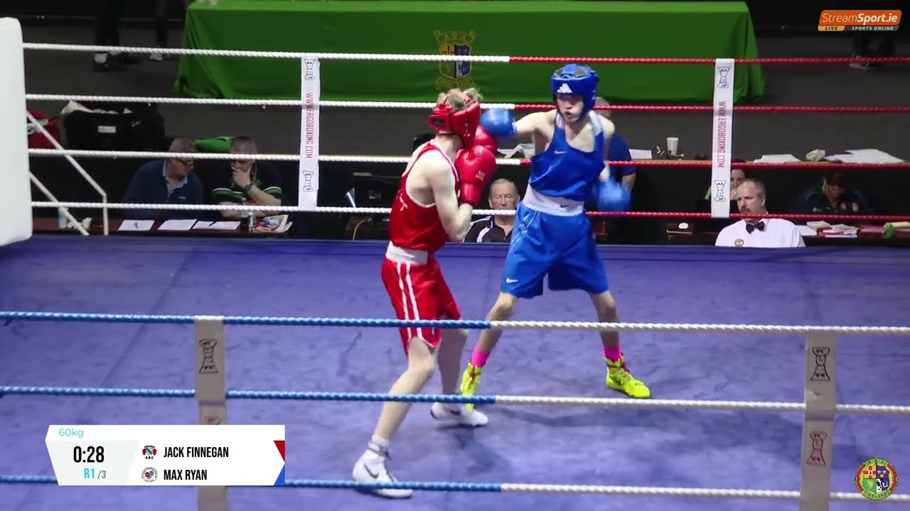 Jack Finnegan (Dealgan) and Max Ryan (Lucan) contested this 2024 National Senior Cadet Championship 60kg quarter final, streamed by @streamsport-ie7508 #boxing #boxingireland #boxer #irishboxing #IABA #olympicsport #iaba #bout #fight #titleboxing #championshipboxing #boxingnews #fightnight