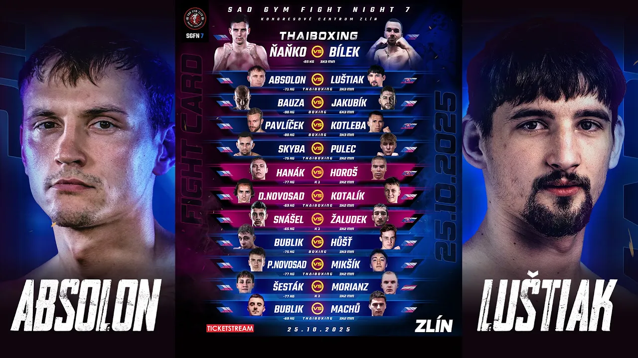 Jiří Absolon (SAD GYM Zlín, Czech Republic) vs Marek Luštiak (Dracula Monacobet Gym Banská Bystrica, Slovakia) SAD GYM FIGHT NIGHT 7 – Highlights Highlights of the fight from SAD GYM FIGHT NIGHT 7, held on October 25, 2025 in Zlín. Muay Thai bout at 71 kg, scheduled for 3 × 3-minute rounds. FIGHT INFORMATION Discipline: Muay Thai Weight class: −71 kg Rounds: 3 × 3 minutes Event: SAD GYM FIGHT NIGHT 7 Date: October 25, 2025 Location: Zlín, Czech Republic HASHTAGS #muaythai #thaiboxing #highlights #sadgymfightnight #fight #martialarts #combat #czechrepublic #slovakia