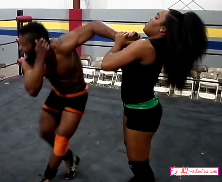 Woman Dominates Man in Grappling Hold