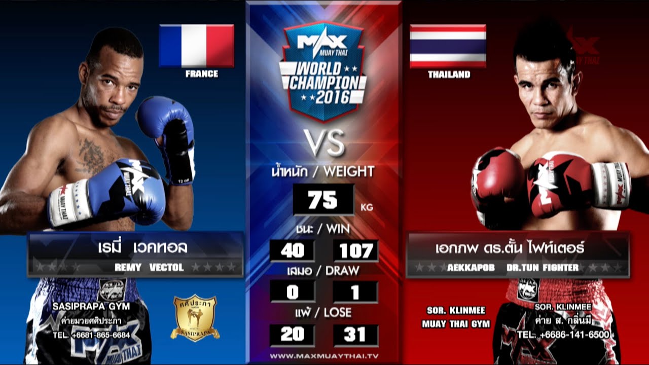 Max Muay Thai WORLD FIGHT 75 KG 2016 date February 21, 2016 Match 1 REMY VECTOL (SASIPRAPAGYM) (FRANCE) VS AEKKAPOB DR.TUN FIGHTER (THAILAND) MAX MUAY THAI ประจำวันที่ 21 กุมภาพันธ์ 2559 คู่ที่ 1 เรมี่ เวคทอล (ศศิประภายิม) (ฝรั่งเศส) VS เอกภพ ดร.ตั้น ไฟท์เตอร์ (ไทย)