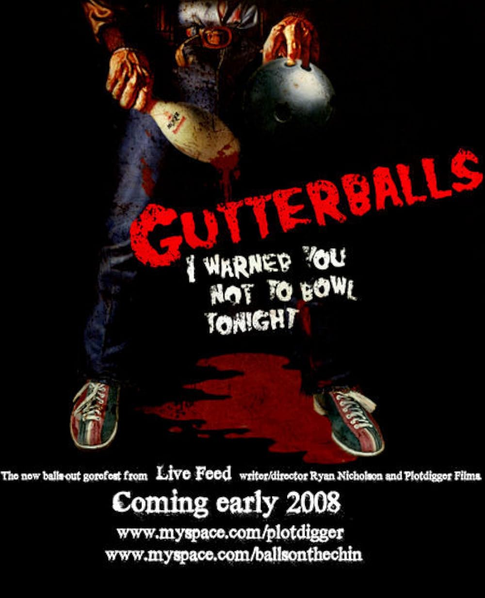 I think we just found the new master of horror cinema folks, and his name is Ryan Nicholson. His first film Torched, was an excellent short rape/revenge film with brutal and very realistic scenes of violence. Then his second film, Live Feed, I thought was fantastic. It was a great throwback to Grindhouse splatter films. Now we have Gutterballs, the best horror film of 2008. If your looking for gore, then you got it. Gutterballs featured some of the best gore effects I've seen in a long time. This film is for true horror fans and gore hounds everywhere. All the actors did a great job, and it had one heck of a great 80's soundtrack. One of the best horror films of the year and of the decade.