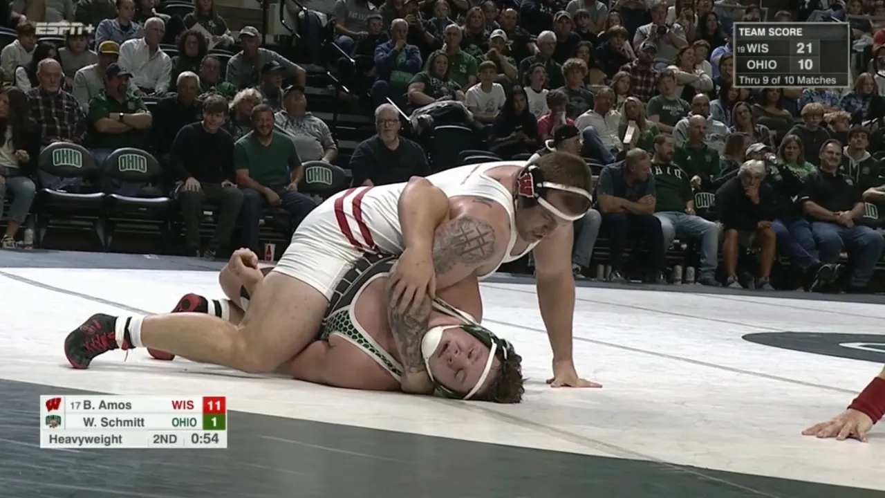 2025/26 Ohio vs. Wisconsin wrestling dual HWT #17 Braxton Amos (WISC) fall Wyatt Schmitt (OHIO) I do not own this video, all credit/rights to ESPN/MAC