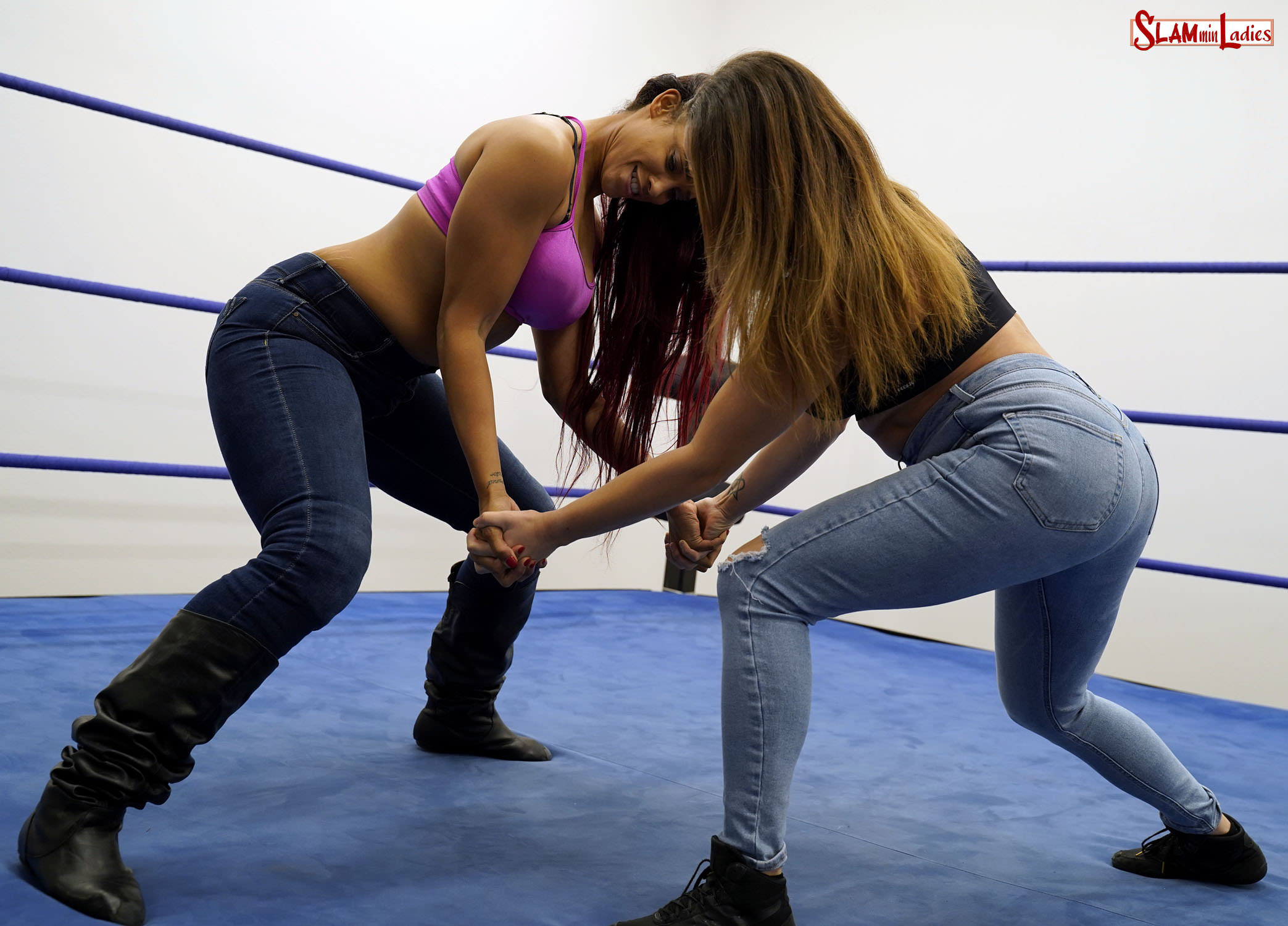 Wearing jeans and sport tops, Rocky and Kaci wage war in a battle to determine who’s the strongest. A violent fingerlock starts things off. The pair are evenly matched until Rocky pulls Kaci in to deliver a brutal kneelift to take control. She shows off her strength, lifting Kaci up before tossing her to the canvas for a Camel Clutch. Kaci fights back, slugging her way back into the fight and showing off her own power with an over-the-knee Backbreaker drop! Targeting Radley’s back, she hauls Rocky up into a tight Bearhug to drain the fight from her. She continues to dominate, this time laying Rocky over her shoulders for a Fireman’s Carry torture rack and follow up Pendulum Swing that puts further pressure on Rocky’s spine. Radley is down but not out. She brawls her way back into the match and levels Lennox with a Clothesline before hauling her up into an Airplane Spin that leaves both wrestlers dizzy! The match is up for grabs and appropriately enough it’s a lights out Powerbomb that proves to be the winning move in this power matchup.