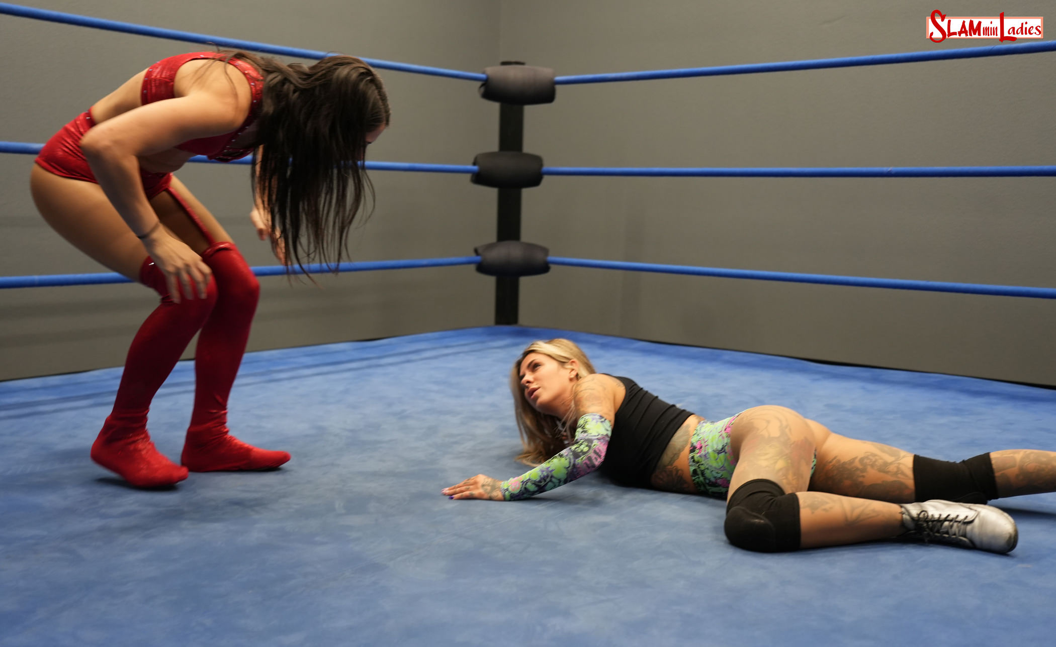 We fade in on Shelly laying face-down on the mat. Unfortunately for her, things are not going to get any better. Enter Mila, who lifts Shelly by the hair and informs her that Jayme Jameson is still paying anyone who beats up a blonde. And Shelly just happens to have golden locks. Mila takes her down to the mat and slams her head-first into the canvas, then wraps Shelly’s hair around the top rope and yanks. Mila slams her into the top turnbuckle, then again tangles Shelly’s hair around the ropes. Mila locks in a Camel Clutch and chokes out Shelly with her own hair, then chokes her against the bottom rope. With Shelly all but out on her feet, Mila takes her around the ring, slamming her head-first into all four turnbuckles. A hair-assisted Snapmare takes Shelly back to the mat, where Mila locks her in one more submission hold, grabs a handful of hair, and waits for Shelly to either tap out or pass out. Either way, someone’s getting a nice payday from Jayme for this effort.