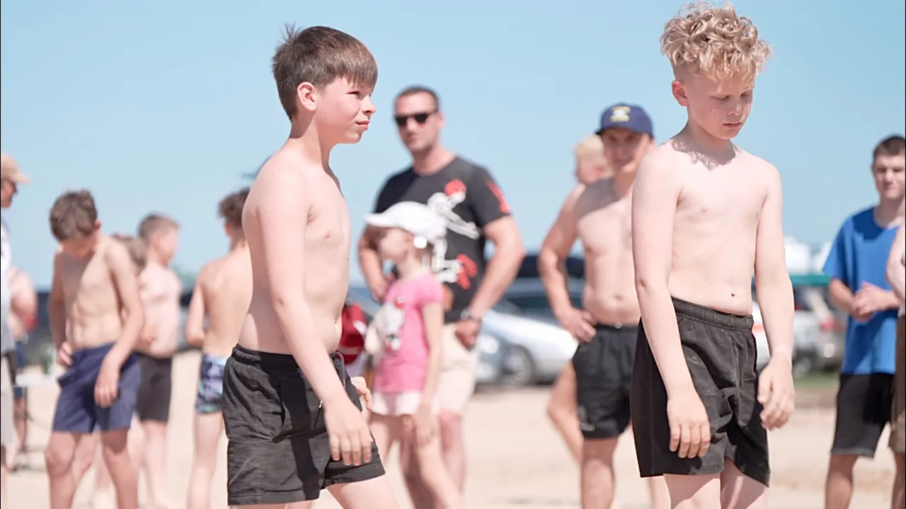 U11 Richard Kleen (EST) vs Maksim Kirilenko (EST) 40kg. Boys youth beach wrestling tournament.