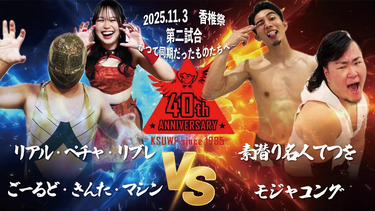 2025年11月3日(月) 香椎祭3日目 第2試合 〜かつて同期だったものたちへ〜 タッグマッチ30分1本勝負 リアル・ペチャ・リブレ ごーるど・きんた・マシン VS 素潜り名人てつを モジャコング #学生プロレス #九州産業大学 #KWF #九州産業大学プロレス研究部 #KSUWF #UWF #RWF #香椎祭 #Bloom KWF公式X(Twitter)↓ https://x.com/kwf_puro... KWF公式Instagram↓ https://www.instagram....