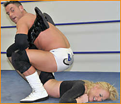 Special guest ref Rain. Brad really lives up to the attitude part of his name. Quite a bit of cheating early on from him but Amber keeps coming back and gaining control. You have to feel sorry for Amber because this guy doesn't take it easy on the blond. A nice Headscissors from Amber and she gets the upper hand for a time before Brad goes back to the shortcuts. A mean Boston Crab has Amber almost giving in but she powers her way to the ropes. More torture for Amber as she's put in the Rack but she escapes only to be put in the Crab again. Surfboards have Amber's back in pain but she refuses to give. A surprise DDT from Amber has both wrestlers down and when they get to their feet it's Amber with the fire. Brad tries to block Amber with a Rock Bottom but Amber escapes and shoots him off the ropes. He reverses it and gives Amber a nasty over-the-knee Backbreaker. That's it for the blonde fighter this day.