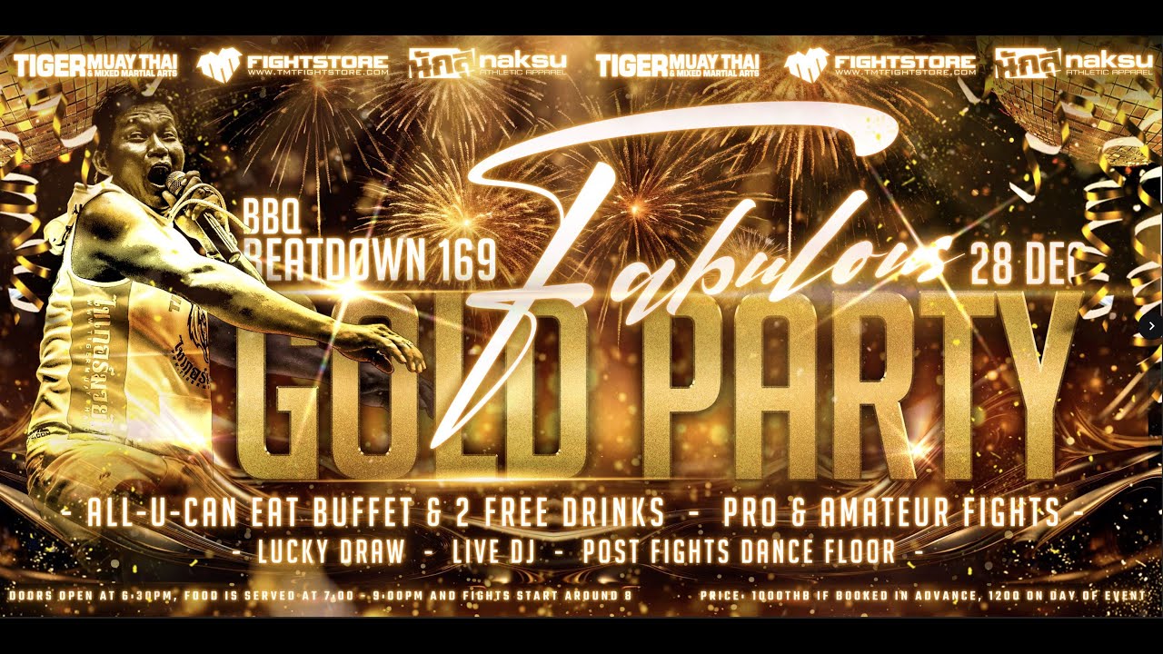 Tiger Muay Thai presents:BBQ Beatdown 169: Fabulous GOLD PARTY Pro and Amateur Muay Thai, MMA and Boxing Fights LIVE! from the paradise island Phuket, Thailand Train with us: https://www.tigermuaythai.com/online-booking Get TMT gear: https://www.tmtfightstore.com/en/ Subscribe for more training, instructional and fight videos: youtube.com/tigermuaythai?sub_confirmation=1