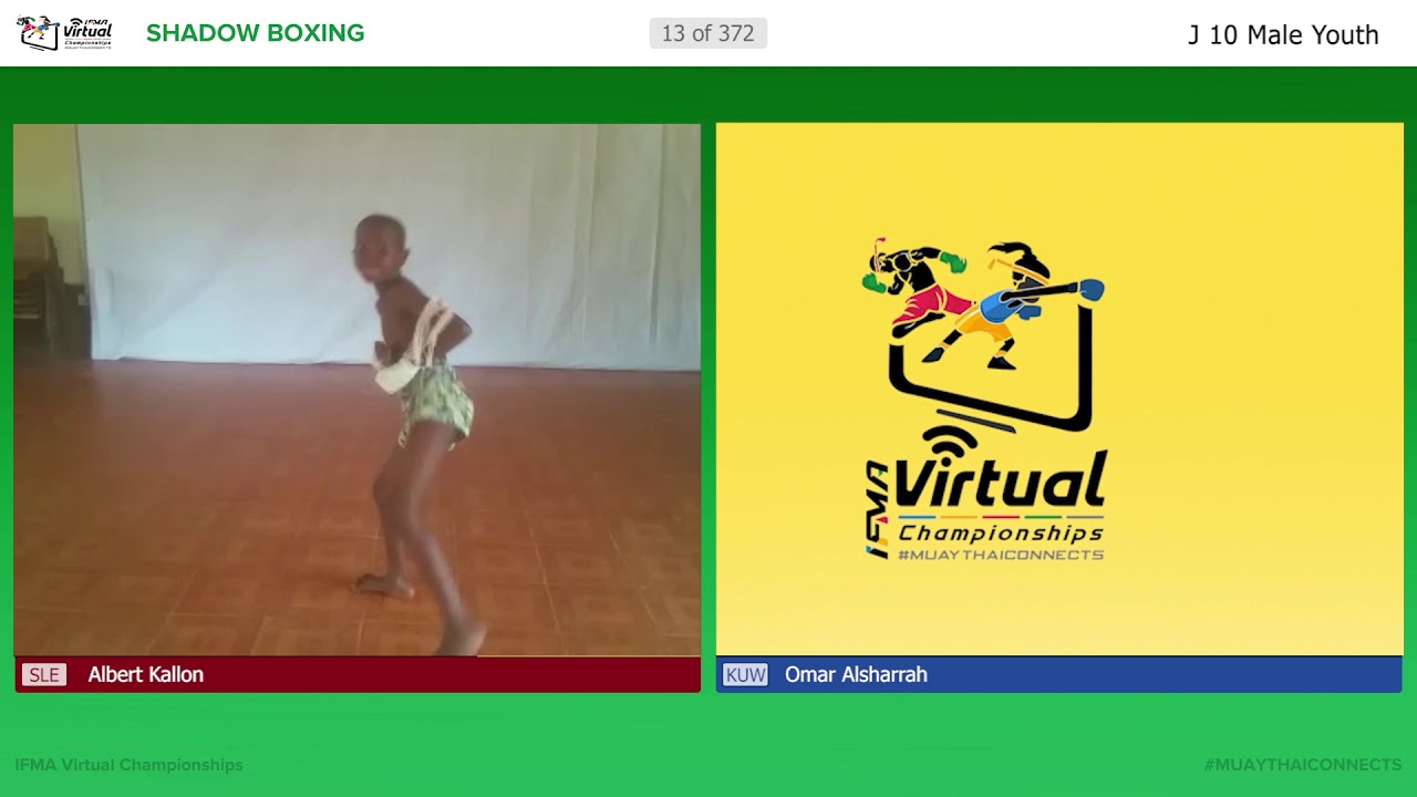 2020 IFMA VIRTUAL CHAMPIONSHIPS Boot #11 - 00:00 (CRO) Marin Golub (FRA) Yanis Carrel Boot #12 - 2:09 (AFG) Mohammad Amiri (RSA) Matthew De Kock Boot #13 - 5:01 (SLE) Albert Kallon (KUW) Omar Alsharrah Boot #14 - 7:39 (ITA) Luca Manchia (TPE) Tsung-Hsia Wu Boot #15 - 10:59 (LBA) Mourad Baryoun (AUT) Dominik Schroedl About tournament: https://virtualchampionship2020.muaythai.sport/index.php Bout results: https://www.ifmalive.com/divisions/64474/brackets All videos: https://virtualchampionship2020.muaythai.sport/vc-videos.php