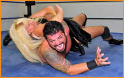 Fans of back-and-forth mixed action need look no further than this titanic match-up! Fantasia is used to having a size and power advantage over most women, but in this video she finds herself having to lock up with the mighty Joey Machete. These two pull no punches in their battle for dominance, as shown by an early exchange of chops that will have you cringing. This is an old school match-up with lots of brawling from both wrestlers. Joey's superior size and strength help him get the better of Fantasia, but he's not above using dirty tactics. He pulls Fantasia's hair, stomps her hands and grinds her face into the mat. Joey won't be mistaken for a gentleman anytime soon. Then again, Fantasia isn't exactly lady-like. She assaults her opponent with nasty strikes including a Headbutt that rocks Joey! This is one female fighter that gives as good as she gets. Fantasia shows an amazing ability to adapt to being the underdog, though even the hardiest of fight fans will wince when a bite to the inner thigh leaves Joey in agony on the mat. In the end, an illegal chop to the throat leads to a vicious neck wrenching hold proves to be too much for one warrior. Though there is a clear winner, both competitors walk away from this match battle tested, having proven that they can hold their own in the squared circle against any kind of opponent.