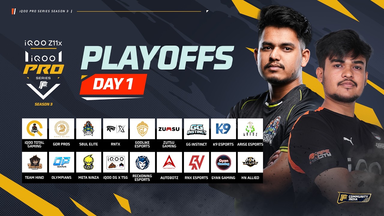 Day 1 of the iQOO Pro Series Season 3 kicks off with 18 elite Free Fire Max squads battling it out in the Playoffs Stage! Only the Top 12 make it directly to the Grand Finals. Watch it all unfold LIVE! 💰Total Prize Pool: ₹10 Lacs 👥 Team List: GROUP A: iQOO TOTAL GAMING S8UL ELITE META NINZA GG INSTINCT AUTOBOTZ Community Cup #1 Aerobotz Esports Group B: TEAM HIND OLYMPIANS iQOO OG X TSG ZUTSU GAMING RECKONING ESPORTS GODLIKE ESPORTS Group C: GDR PROS RNTX K9 ESPORTS RNX ESPORTS GYAN GAMING Community Cup #2 HN Allied 🗺️ Today’s Map Rotation: Match ⚔️1: Bermuda Match ⚔️2: Purgatory Match ⚔️3: Kalahari Match ⚔️4: Nexterra Match ⚔️5: Alpine Match ⚔️6: Solara T&C - https://bit.ly/iQOOProSeries_Terms *On the basis of Antutu score of 1M+, amongst the smartphones launched in the price segment under INR 25K, till 12th March 2026. *iQOO Z11x is the only smartphone in India offering 7200 mAh battery backup under 20K INR as of 12th March 2026. #iQOOProSeries #freefiremax #iQOOZ11x #gaming Follow us: https://www.instagram.com/iqooesports/ https://www.facebook.com/iQOOIndia https://x.com/IqooInd https://www.youtube.com/@iqooesports5550