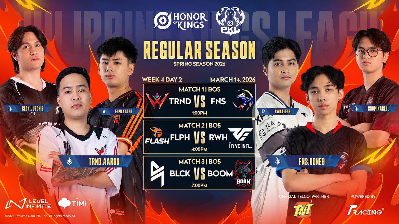 LIVE | PKL Honor of Kings Spring Season 2026 | Regular Season Week 4 - Day 2 Panoorin ang mga sumusunod na matches para sa Week 4 Day 2: ⚔️ 1:00PM – TRND vs FNS ⚔️ 4:00PM – FLPH vs RWH ⚔️ 7:00PM – BLCK vs BOOM 📺 Tutok sa official broadcast channels ng #PKLSpring2026 kasama ang ating official telco partner @tntph, powered by @ttracingph. #HonorOfKings #HOKEsports #PagkakataonMoNa