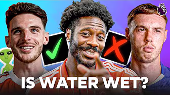 Love this video? We’ve got even more for you to enjoy on the Premier League App iOS: https://preml.ge/PLAppYT Android: https://preml.ge/PLAppAYT Join Premier League players as they debate the internet’s toughest questions! Is Water Wet? What colour is a tennis ball? Do aliens exist? And are there more wheels or doors in the world? Find out what they think! Featuring Marc Guéhi, Cole Palmer, Declan Rice, Cody Gakpo, Phil Foden, Antoine Semenyo and more! Subscribe to the official Premier League YouTube channel: http://preml.ge/PremierLeagueYouTube Premier League website: http://preml.ge/PremierLeagueWebsite Follow the Premier League on Instagram: http://preml.ge/PremierLeagueInstagram Follow the Premier League on X: https://preml.ge/PremierLeagueX Follow the Premier League on WhatsApp: https://preml.ge/PremierLeagueWhatsApp Like the Premier League on Facebook: http://preml.ge/PremierLeagueFacebook Play Fantasy Premier League: http://preml.ge/FantasyPremierLeague To license Premier League match footage: https://imgreplay.com/contact #football #premierleague #soccer Your safety online Visit the Child Exploitation and Online Protection website for confidential support if something has happened online which has made you feel unsafe, if you are worried about someone else or to report online abuse. (https://www.ceop.police.uk/safety-centre) You should contact the Police by calling 999 if you or anybody else is in any sort of danger. Visit CEOP’s Thinkuknow website for advice and guidance on safe surfing and staying safe online for example when using mobile phones, blogs, social media, chatting, online gaming and emailing. (https://www.thinkuknow.co.uk) You can also visit the Premier League safeguarding page for more information. (https://www.premierleague.com/safegua...)