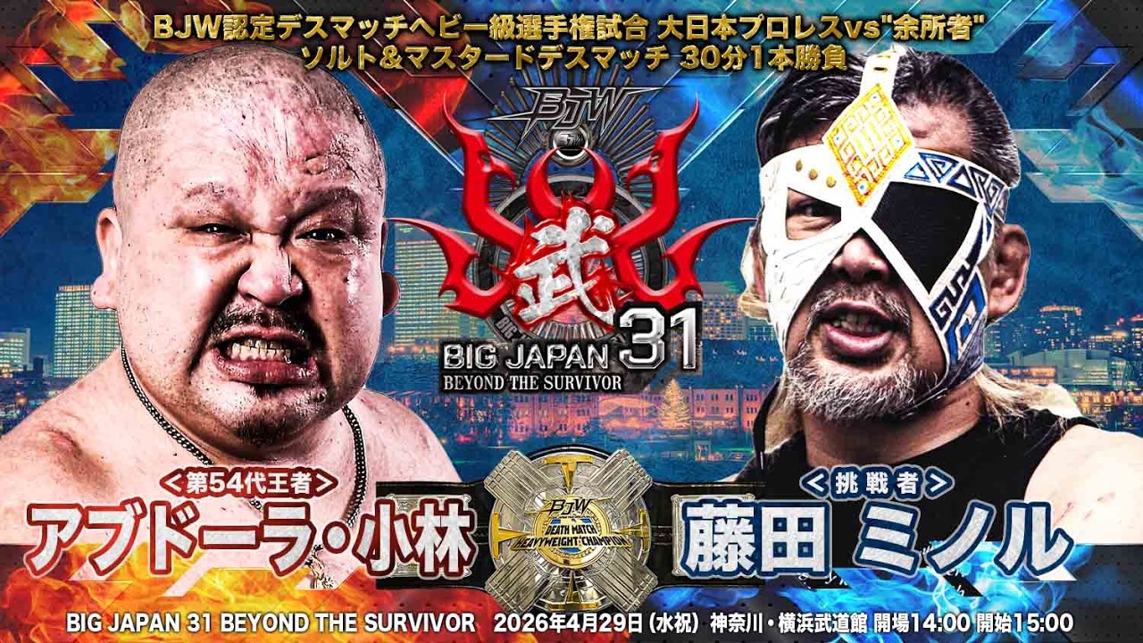 ☆🎦2026年4月29日(水祝)神奈川・横浜武道館大会は全試合メンバーシップ「BJW CORE YouTube」にて生配信!! →https://youtube.com/live/N1hCELFeWjU 2026年4月29日(水祝)神奈川・横浜武道館大会の情報はこちら→ https://bjw.co.jp/schedule/s2026-04-29/ Kanagawa・Yokohama Budokan (April. 29. 2026) All matches live streamed on YouTube membership. →https://youtube.com/live/N1hCELFeWjU ※ Due to music licensing, some wrestlers'entrance themes muted during the event. ☆試合データ☆ 神奈川・横浜武道館大会 【日時】2026年4月29日(水祝)15:00試合開始 【会場】神奈川・横浜武道館大会 ▼セミファイナル BJW認定デスマッチヘビー級選手権試合 大日本プロレスvs"余所者" ソルト&マスタードデスマッチ 30分1本勝負 【第54代王者】アブドーラ・小林 VS【挑戦者】藤田ミノル ※3度目の防衛戦 ▼English Information April 29 ,2026 Yokohama Budokan 8th match BJW Deathmatch Heavyweight Championship Salt & Mustard Death Match 30 minutes limit 【CHAMPION】 Abdullah Kobayashi vs 【CHALLENGER】 Minoru FUJITA 【編集】 関茂隆真 Ryuma SEKIMO https://bjw.co.jp/profile/sekimo-ryuma/ https://twitter.com/sekimoryuma https://www.instagram.com/sekimoryuma/ 【ファイティングミュージック】 Sally https://youtube.com/@sally_guitar BJ-SHOP accept orders from overseas! Click here, and you can buy BJW items!→ https://bjw-shop.com/ Twitter English account→ https://twitter.com/BjwEnglish You can watch all BJW videos ,if you subscribe BJWCORE→ http://bjwcore.com/ ☆あなたの街に大日本プロレスが!?大会チケットのご購入はこちらから!!☆ ▼大日本プロレス公式通販サイト「BJ-SHOP」→ https://www.bjw-shop.com ▼チケットぴあ→ https://w.pia.jp/t/bjw/ ▼イープラス→ https://eplus.jp/bjw/ ▼ローソンチケット→ https://l-tike.com/sports/bjw/ ☆大日本プロレス公式サービス一覧☆ ▼月額888円で大日本プロレスが見放題!「BJW CORE 」→ http://bjwcore.com/ ▼大日本プロレス公式HP→ http://www.bjw.co.jp ▼大日本プロレス公式Twitter→ https://twitter.com/BJWOfficial ▼大日本プロレス公式Instagram→ https://www.instagram.com/bjw_official/ ▼大日本プロレス公式TikTok→ https://www.tiktok.com/@bjw_official ▼"その効果反則級!!!"「販促レスラー」→ https://www.hansokuwrestler.com/ ▼ニコニコ生放送「大日本プロレスch」 → https://ch.nicovideo.jp/bjw 煽り動画 煽りVTR #プロレス #大日本プロレス #BJW #prowrestling #デスマッチ #deathmatch #蛍光灯デスマッチ #蛍光灯デスマッチ #アブドーラ小林 #藤田ミノル