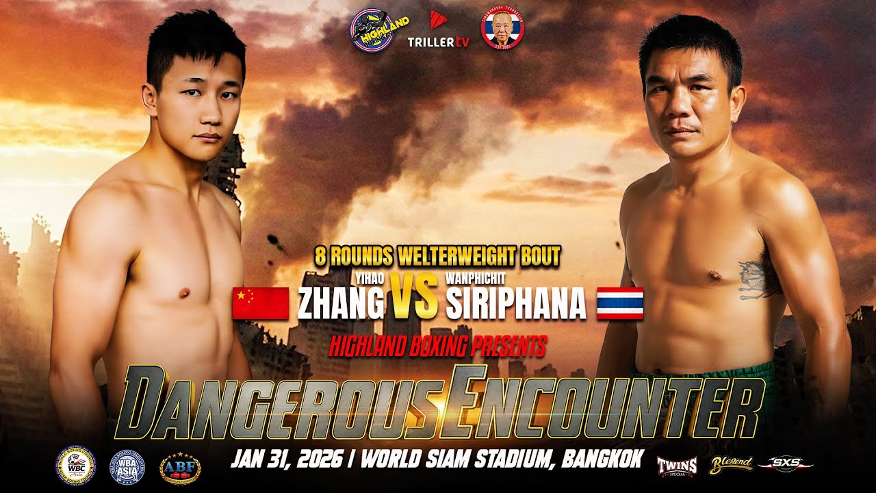 Highland Naris Boxing Promotions presents Dangerous Encounter January 31, 2026 | World Siam Stadium, Bangkok An intense 8-round super lightweight clash as Yihao Zhang takes on Wanphisit Siriphana in an international showdown. Speed, power, and skill will be on full display as both fighters aim to dominate the ring. Expect relentless action, sharp exchanges, and a thrilling fight from the opening bell to the final round. #YihaoZhang #WanphisitSiriphana #SuperLightweight #8Rounds #DangerousEncounter #HighlandNarisBoxing #Boxing #FightNight #BangkokBoxing #WorldSiamStadium #ProBoxing #InternationalBoxing