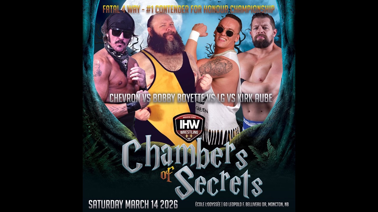 Fatal 4 Way #1 Contender IHW Honour Title: Big Bad LG Logan Green vs Bobby Boyette vs Alberta Clipper Chevron vs Defiant Kirk Aube | IHW Chambers of Secrets - Match #5 🎉 Wyatt Laking at MacDonald Buick GMC Cadillac and Keep Sharp presents IHW Wrestling: Chambers of Secrets 📅 Saturday March 14, 2026 📍 École Odyssée in Moncton 🤝 Thank you to our partners: Keep Sharp, MacDonald GMC, U-Haul on Trinity Rd, Supplement King, Hilton Garden Inn, Mini Mall Storage, Gaetan Lanteigne Photographie, AW Media, Brad MacDonald web design, GoodLife Dieppe, Tri-City Tides, Max 103.9, Mini Monsters & Sportrock 📱Follow us: 🌐Ihwrestling.ca Facebook.com/IHWwrestling IG @ihw_wrestling X @WrestlingIHW YouTube: @WrestlingIHW 2022-current & @InnovativeHybridWrestling 2005-2021 Innovative Hybrid Wrestling is a family friendly independent professional wrestling organization out of Moncton, New Brunswick, Canada. We host pro wrestling events across New Brunswick and parts of Nova Scotia. We are available for festivals, public events, fundraisers, private bookings, birthdays and other events. Contact wrestlingihw@gmail.com for further information. #Wrestling #ProWrestling #IHW #WWE #AEW #TNAWrestling #ExploreNB #Canada #NewBrunswick #NovaScotia #luchalibre #lucha #aaa #cmll #Iceland #Maritime #MaritimeWrestling #neworleans #alberta #albertacanada #albertaclipper #defiant #northernstar #undeniable #big #bigbad