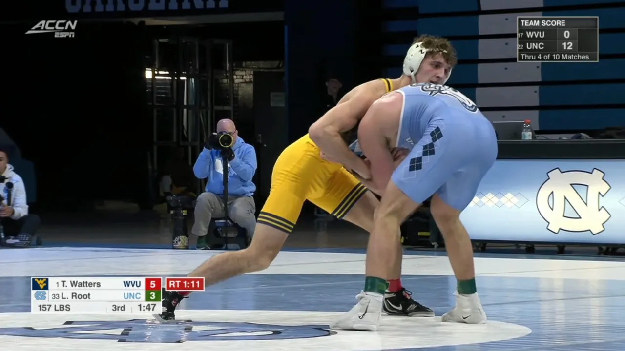 2025/26 North Carolina vs West Virginia wrestling dual 157lbs #1 Ty Watters (WVU) dec #33 Laird Root (UNC) I do not own this video, all credit/rights to ESPN/ACC